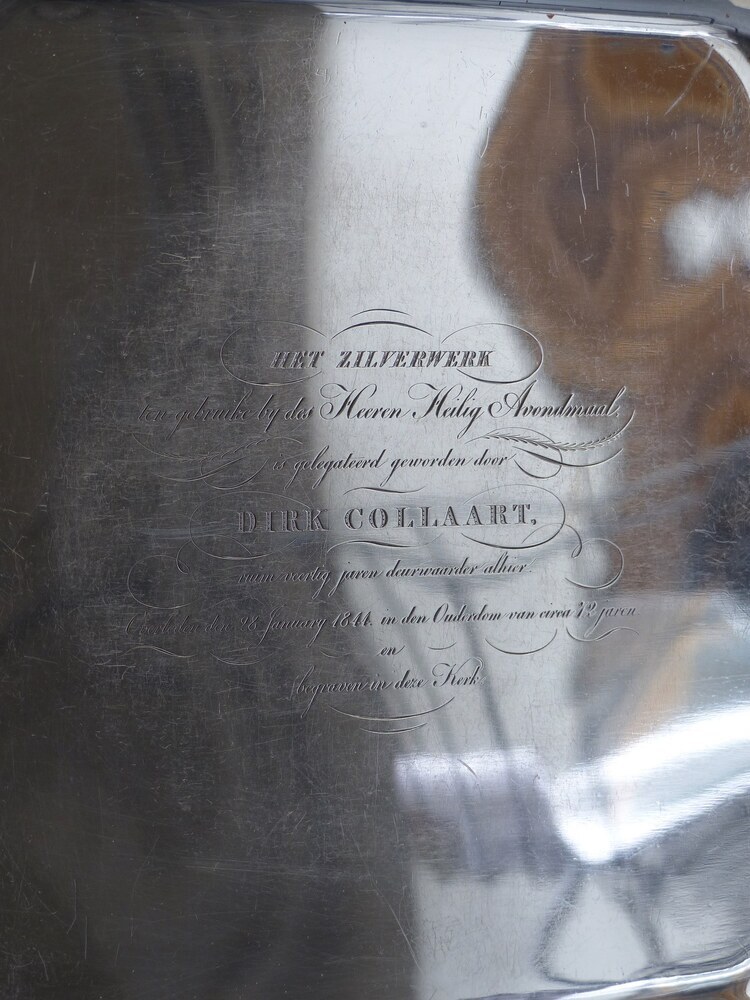 'Het zilverwerk ten gebruike bij des Heeren Heilig Avondmaal / is gelegateerd geworden door / Dirk Collaart. / ruim veertig jaren deurwaarder alhier. Overleden den 28 Januarij 1844. in den ouderdom van circa 72 jaren. / en / begraven in deze Kerk.'