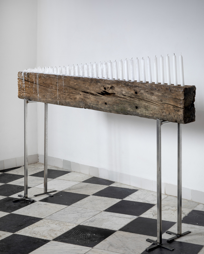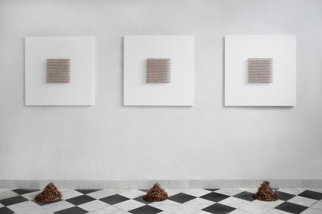 Aan de muur in de Collegekamer hingen drie witte canvassen waarop stalen spijkers vierkanten vormden. De titel Pregação verwees zowel naar de betekenis van dit woord in het Portugees, ‘preken’, als naar het werkwoord ‘pregar’: vastzetten of vasthouden met spijkers. In dezelfde ruimte was als een achtergebleven spoor van gebed een houten sculptuur opgesteld. Kaarsen waren tot verschillende hoogtes opgebrand.