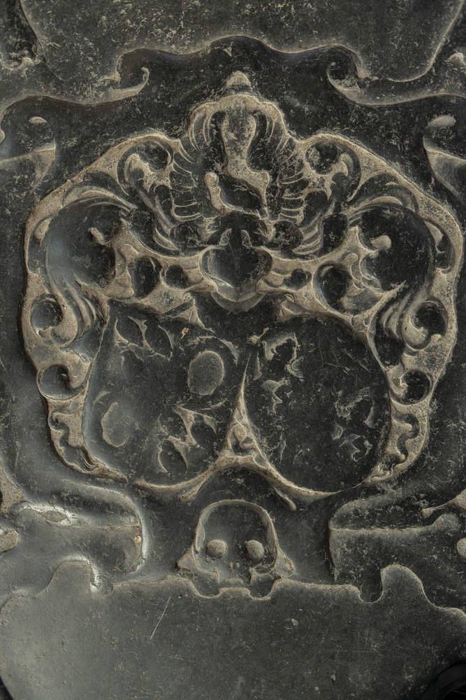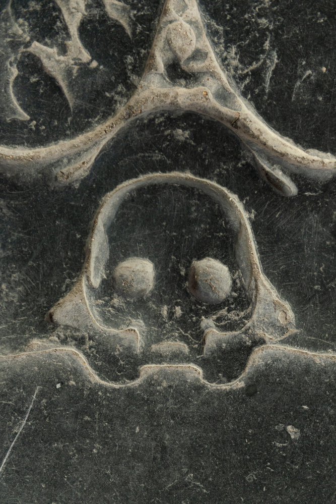 Naam niet op zerk. Eig. 1642. Rijk versierde zerk: gesleten kwab- of Lutma-ornament, waarschijnlijk geinspireerd op zerk DE GRAEFF in H. Koor, grover: midden: 2 alliantie wapens, mann (l.) gevierendeeld: l.b. en r.o. elk 3 patrijzen, r.b. en l.o. een krans; vrouw. wapen: l.b. en r.o. een leeuw.